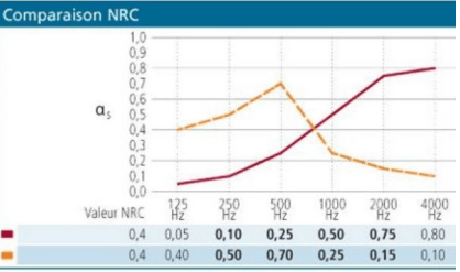 El gráfico adjunto muestra que 2 productos con prestaciones muy diferentes pueden tener el mismo coeficiente NRC